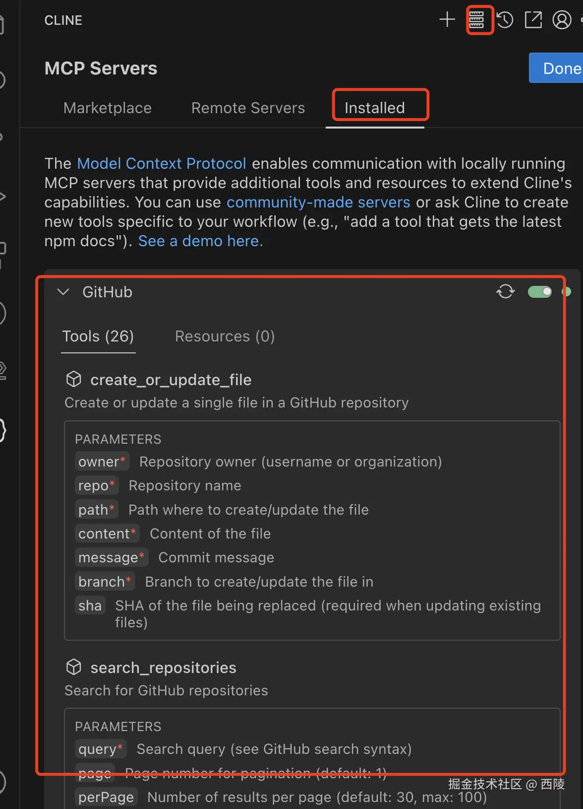 在MCP Server 页面选择已安装的 MCP Server,如果显示绿的按钮,就表示已经连接,并可以查看 MCP Server 提供的工具。
