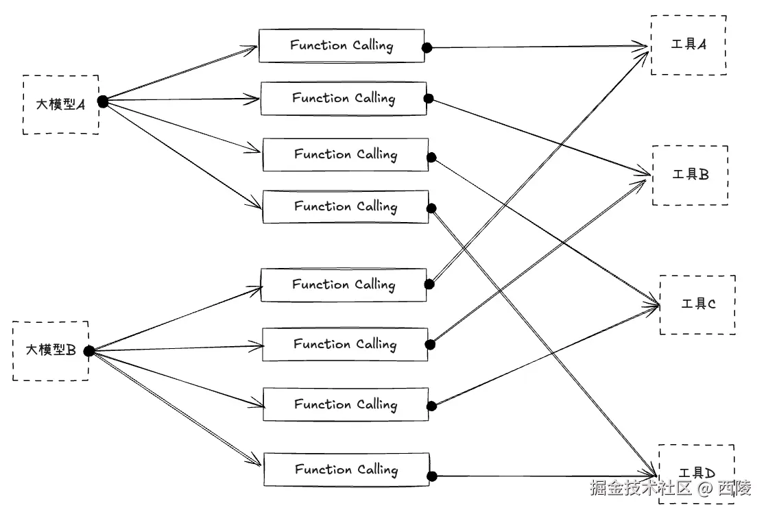 OPEN AI最开始提出这项技术的时候,并没有想让它成为一项标准,所以虽然后续很多模型也支持了Function Call的调用,但是各自实现的方式都不太一样。这也就意味着,如果我们要发开一个