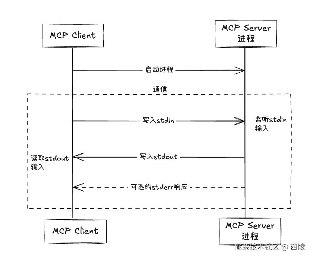 MCP Client 将 MCP Server 作为一个子进程启动,运行在本地环境,它们通过标准输入/输出流进行通信,消息格式为 JSON-RPC ,整体流程如下:
