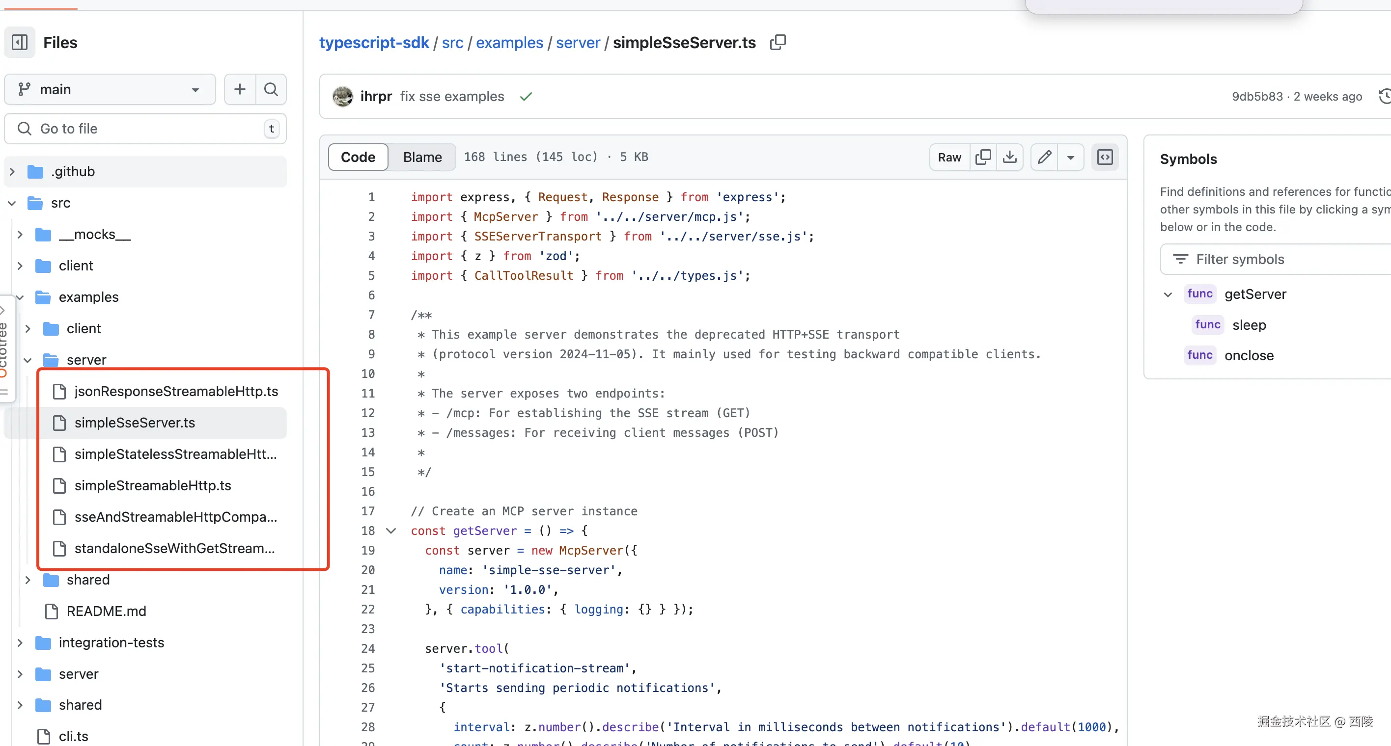 整个开发流程写的非常清晰,跟着官方的流程就能快速开发一个 MCP Server,但是官方文档中只给出了 STDIO 类型的 MCP Server 开发示例,如果想学习 SSE 类型的 MCP Server 开发流程可以到 SDK 的 github 仓库中找到对应的示例: