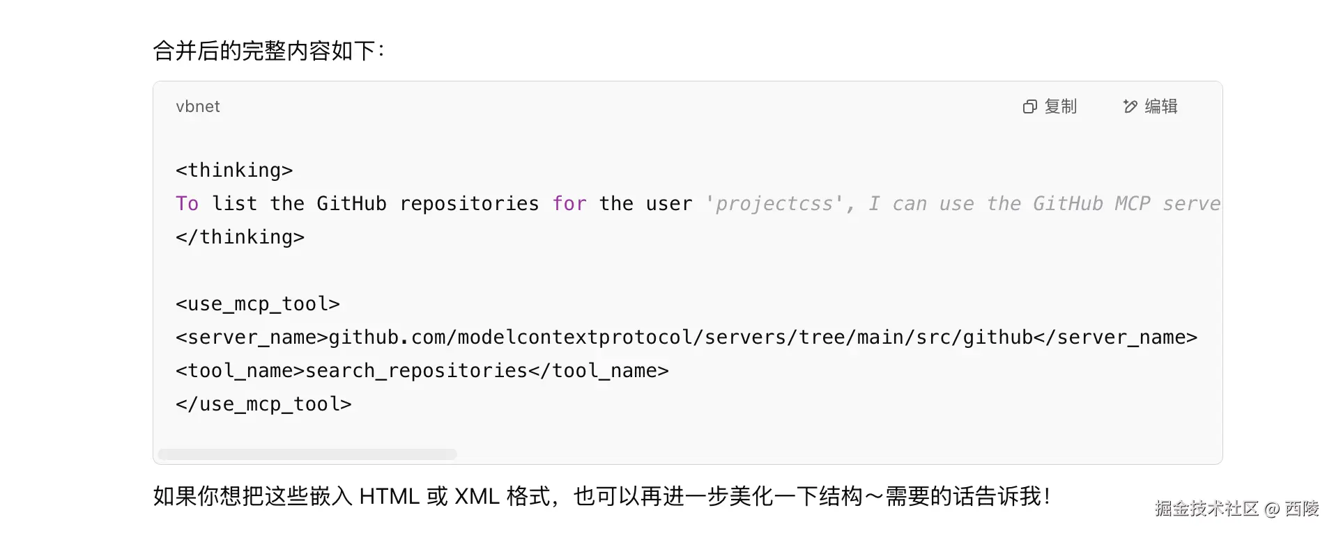 这里的返回和系统提示此中要求的是一致的,在 中展示大模型对用户需求的分析及满足客户需求要调用的工具。在 <use_mcp_tool> 标签中展示了调用的工具及其传入的参数。