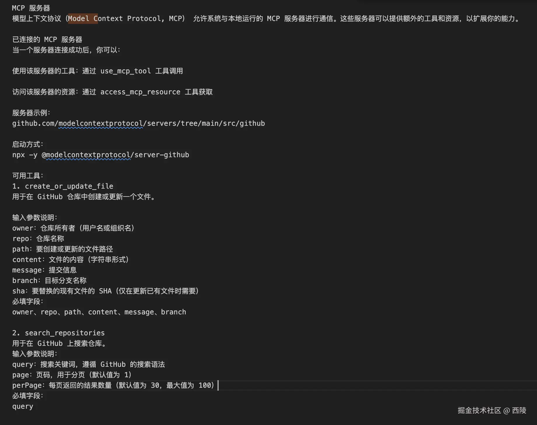 接下来就可以直接调用 MCP Server 中的工具来操作 github 仓库,比如在输入框中输入查询 query: