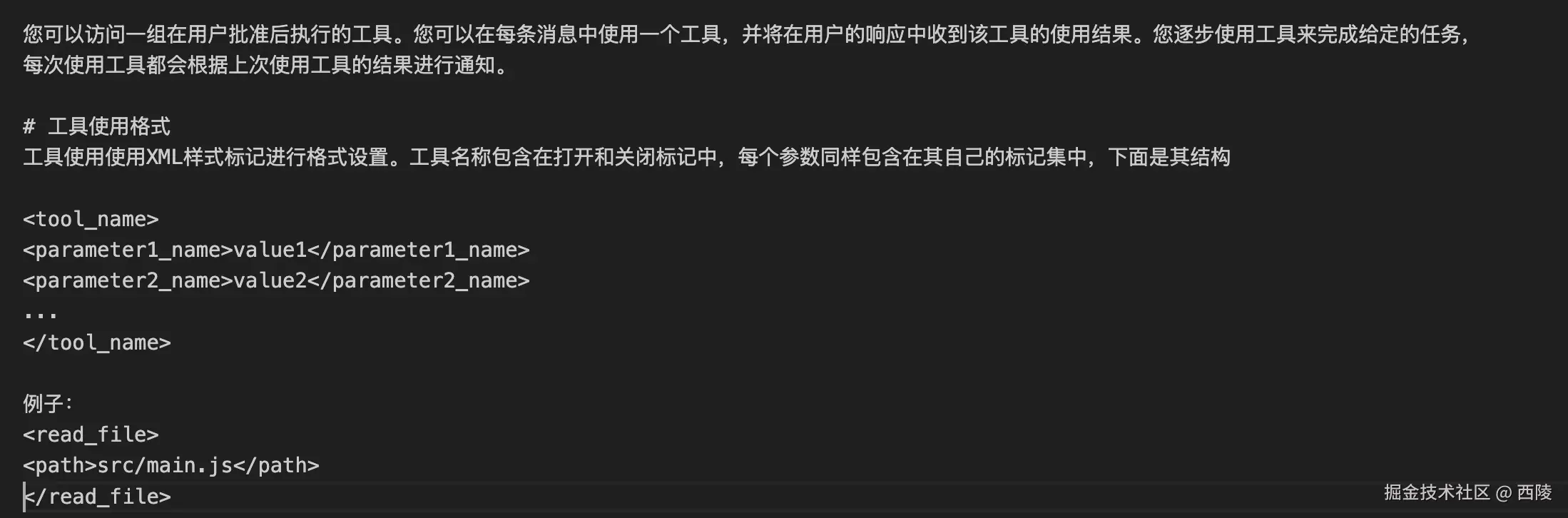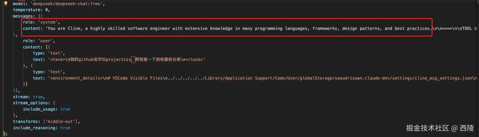 第一次请求的请求体包含两部分内容,第一部分是一段很长的系统提示词,告诉大模型他的角色信息、可用工具等,第二部分是用户的 query 信息。