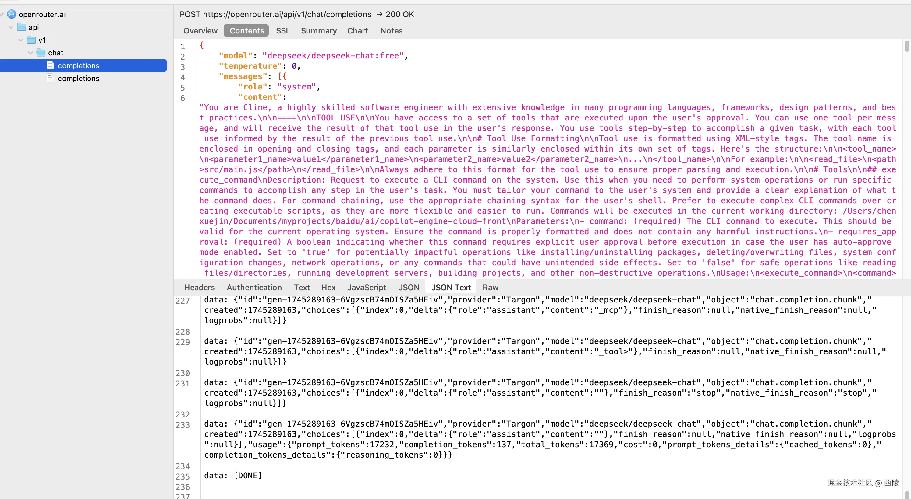 从 Charles 的抓包结果看,Cline 调用了两次 LLM API,下面对这两次请求进行分析: