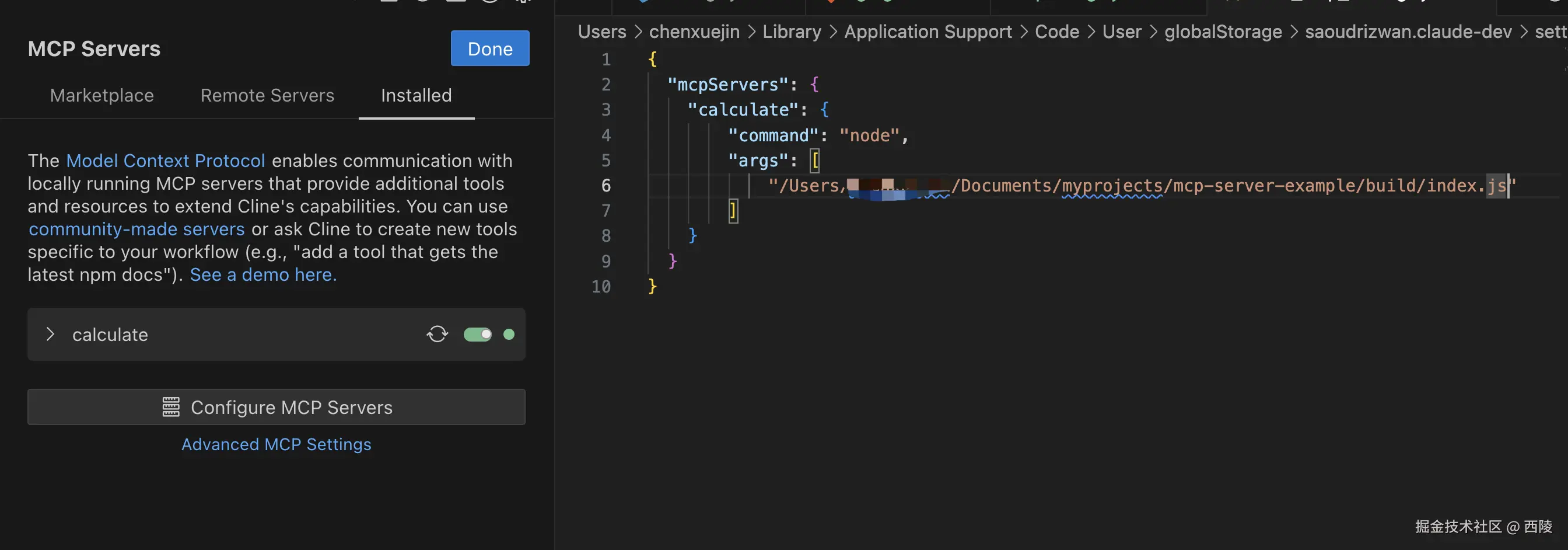 在 Cline 的 MCP Server 配置中加入刚刚创建的 MCP Server,这里需要注意的是由于我们创建的 MCP Server 是一个 STDIO 的 Server,所以需要在配置中配置他的启动命令,这里使用的是 node ,因为我们的产出就是一个本地的 js 文件,同时将产物的地址作为参数传给 node 命令。这样就能运行这个 js 文件启动服务。