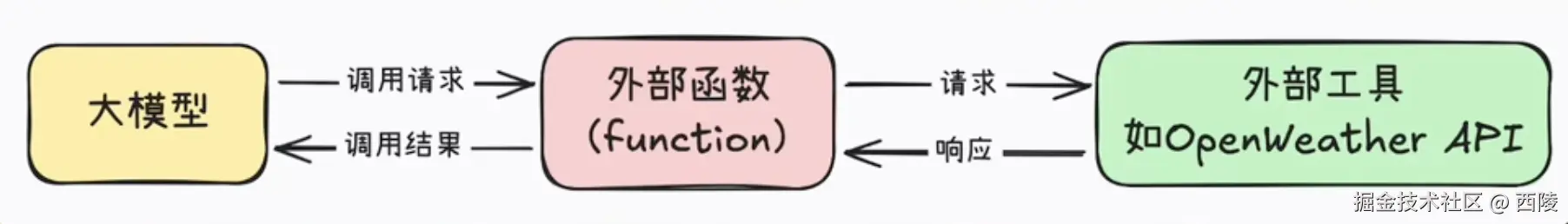 由于底层的技术限制,大模型本身是无法和外部工具进行交互的,因此 Function Calling 的思路就是创建一个外部函数作为中介: