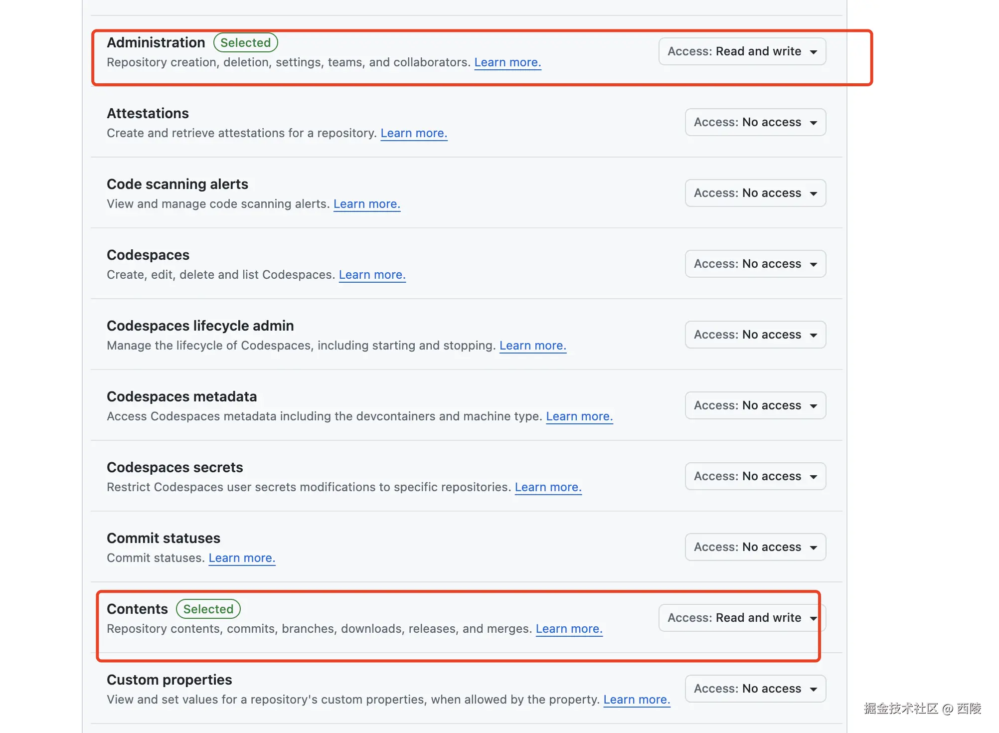 这里我们只需要按照提示点击链接去生成一个 API Key,并给这个 API Key 赋予相应的操作权限,比如仓库内容的访问权限、仓库的创建、删除权限等: