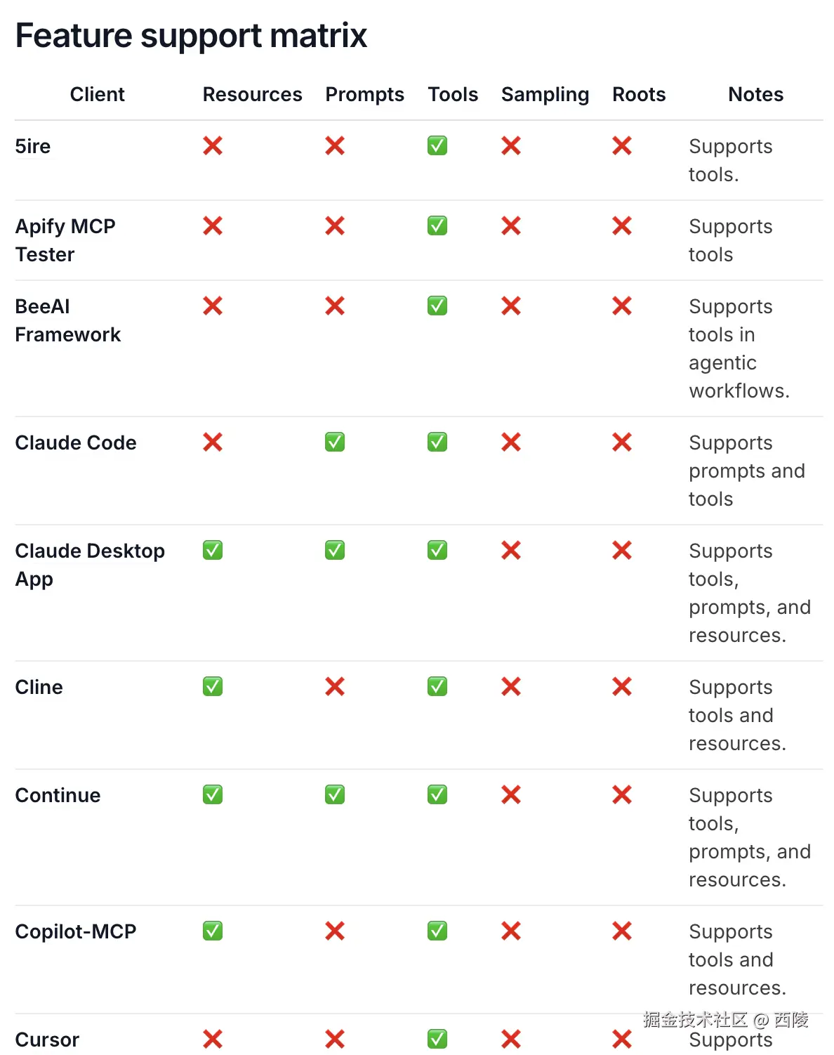 Host 指的是内置了 MCP Client 的应用程序,例如 Claude Desktop、Cursor,内部包含了对大模型的调用,调用 MCP Client 连接 MCP Server 等。在 MCP 的官方文档中已经列举出了目前支持 MCP 协议的 MCP Host: