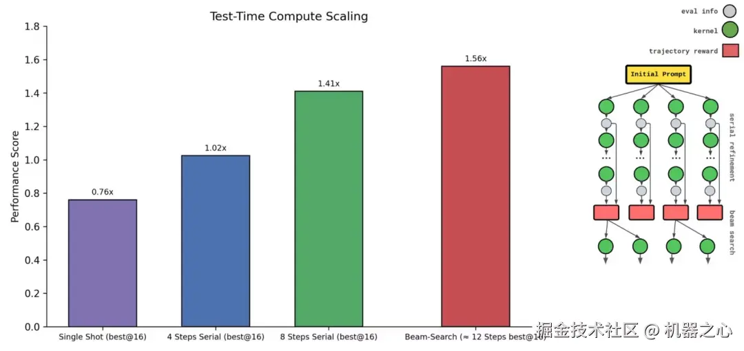 在训练过程中,模型会经历一个迭代反馈循环:从生成的内核中提取反馈,并再对其进行优化。如果内核编译失败,错误轨迹会传递给模型并要求其修复。如果编译正确,系统则会测量运行时间并要求模型进一步改进。