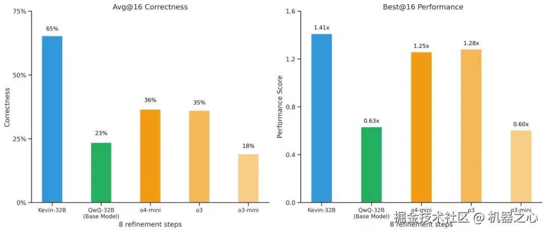 Kevin-32B 基于 QwQ-32B 在 KernelBench 数据集上使用 GRPO 进行了多轮强化学习训练,实现了超越 o3 和 o4-mini 的顶级推理表现。