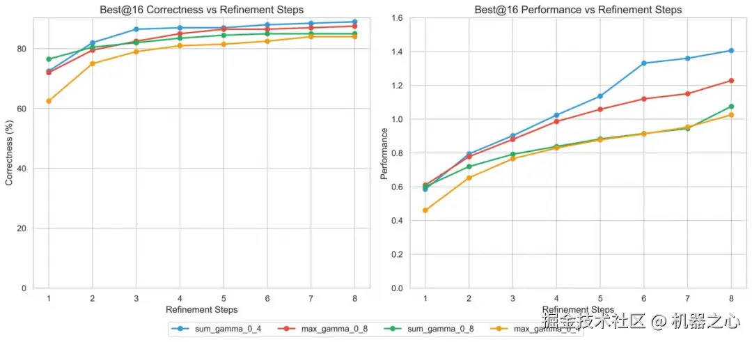 对于每项任务,作者并行采样了 16 条轨迹,并进行 8 个连续的细化步骤。对于每项任务的正确性或性能,他们将 best@16 定义为所有轨迹的最大值,avg@16 定义为所有轨迹的平均值。