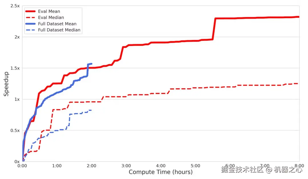 作者将这种行为归因于每种技术在探索 / 利用的帕累托前沿中的不同位置:通过更多的探索,内核可以实现一致的加速,尽管它们可能会错过非常激进的、显著提高平均速度的优化。