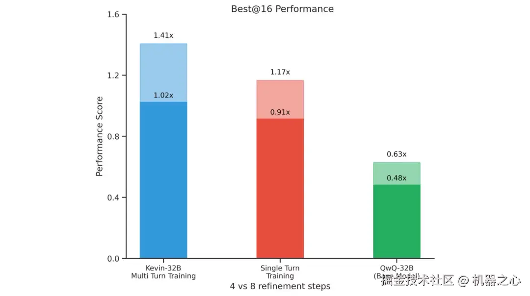 作者之前在相同的多轮推理设置中比较了多轮模型(Kevin-32B)和单轮模型。但由于单轮模型是在单轮环境下训练的,