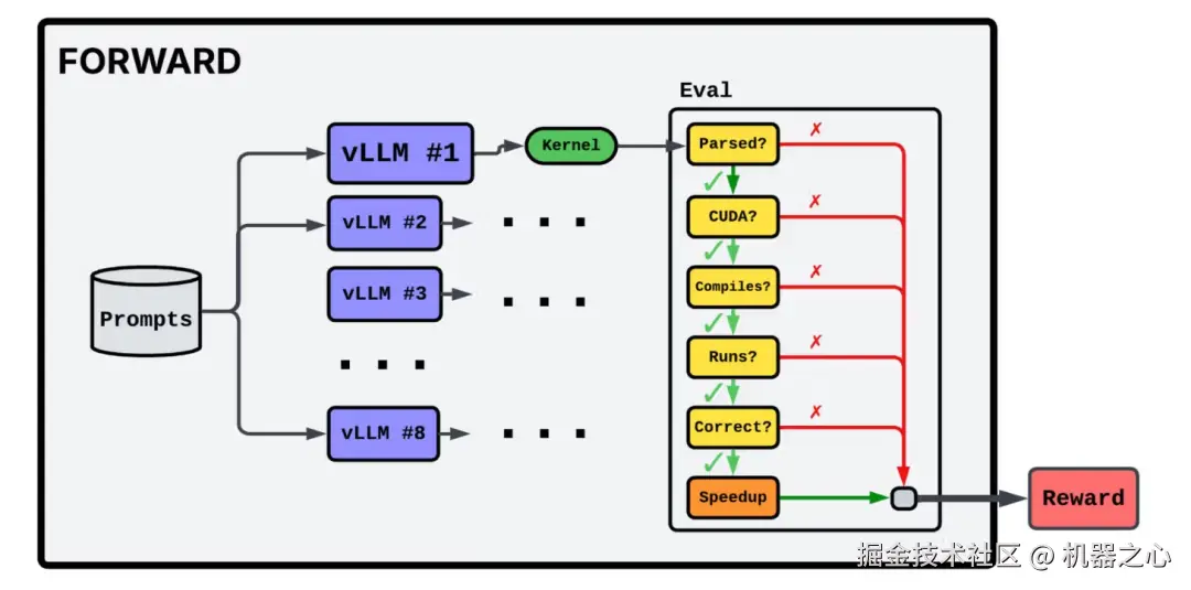 响应生成完成后,每个 GPU 将其 vLLM 引擎卸载到 CPU 内存,并评估其生成的内核。对于每个响应,作者都会检查响应格式是否正确,并提取 CUDA 内核。然后,编译并执行代码,使用随机张量测试其正确性。如果正确,则会对内核的运行时间进行剖析。