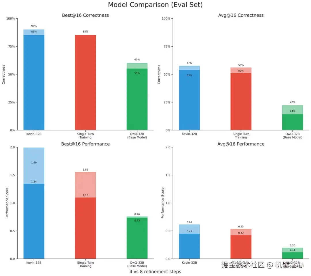 Kevin-32B 也展现出比 QwQ-32B 和单轮训练模型显著的提升。在 4 个优化步骤下,Kevin-32B 的表现略优于单轮模型,但随着优化步骤增加到 8 个,两者之间的差距进一步扩大。这表明,通过鼓励更积极的优化,多轮训练在串行轴上具有更好的扩展性。