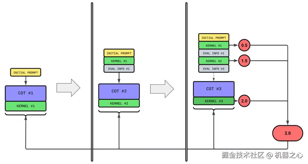 初始方法的机制如下。从初始提示开始,先在每个优化步骤后附加思路链、内核和评估信息,再为整个轨迹分配一个奖励(定义为任何内核获得的最高分数),并使用该序列进行训练。