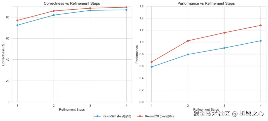 作者根据每个轨迹的最佳内核对其正确性和性能进行评分。在最终训练运行中,每个前向路径由 16 个平行轨迹组成,每个轨迹有 4 个细化步骤,折扣系数为 0.4。与单轮训练不同的是,现在的奖励会稳步增加。