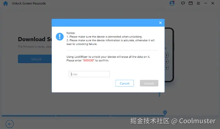 03单击“解锁”开始。仔细阅读通知,输入“000000”确认您同意解锁设备,然后单击“解锁”。