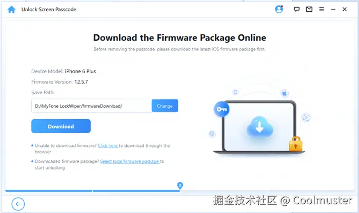02将您的 iPhone 置于恢复模式或 DFU 模式。该程序将自动检测您的设备型号。您可以为固件包选择不同的存储位置,然后单击“下载”开始下载固件。