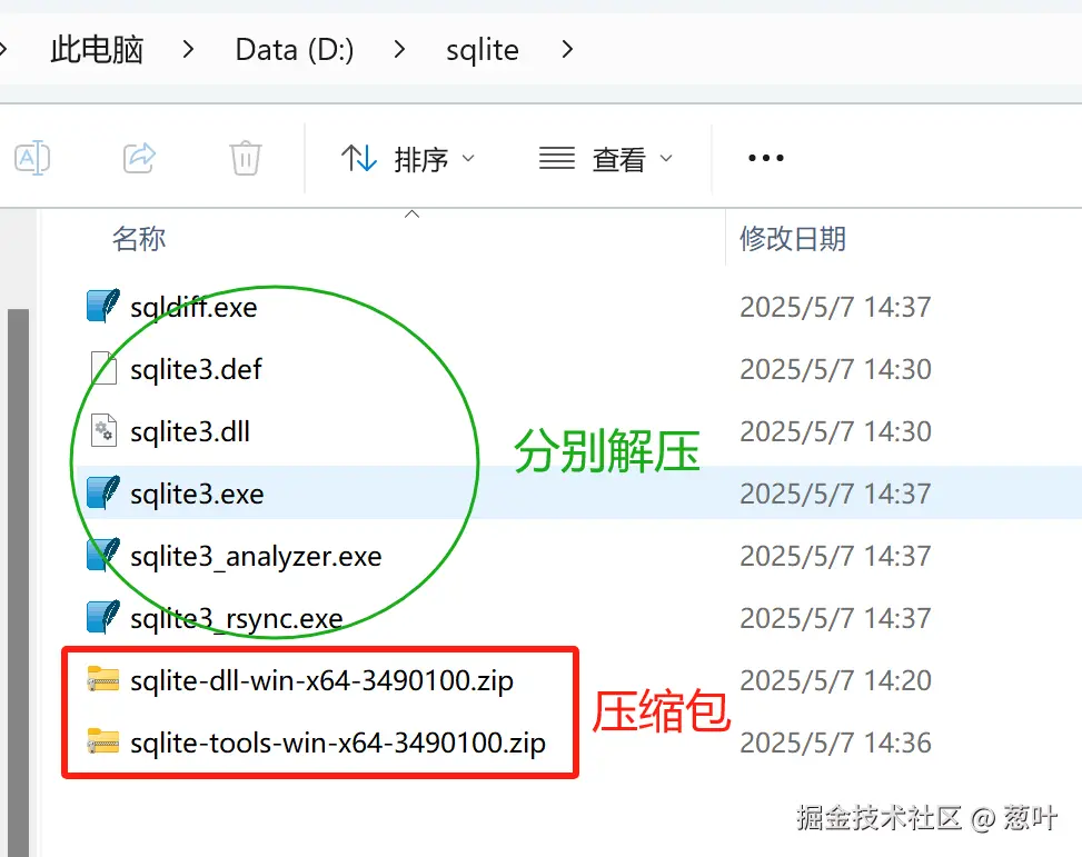 将压缩包放到D盘下的sqlite目录,并分别解压: