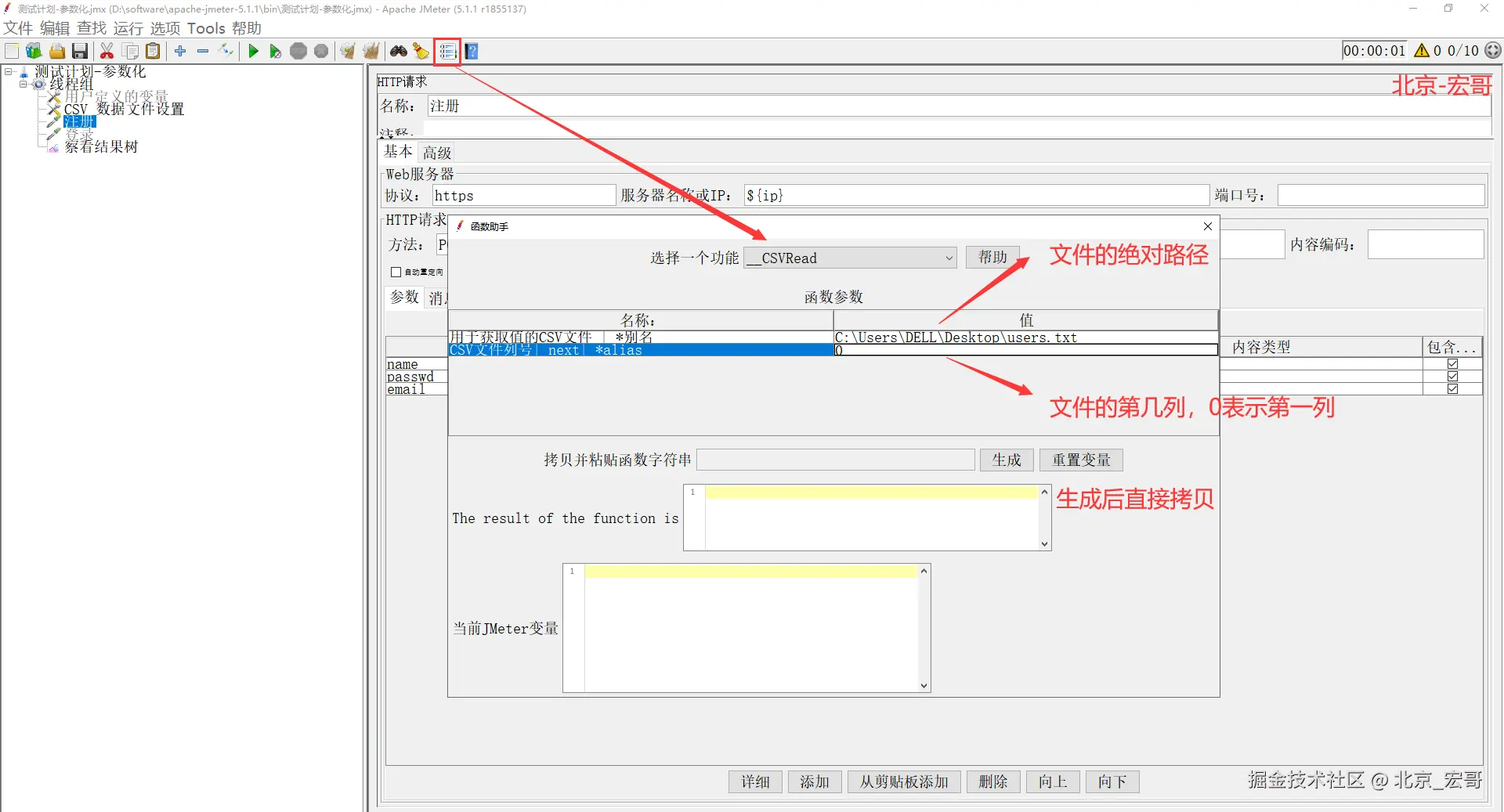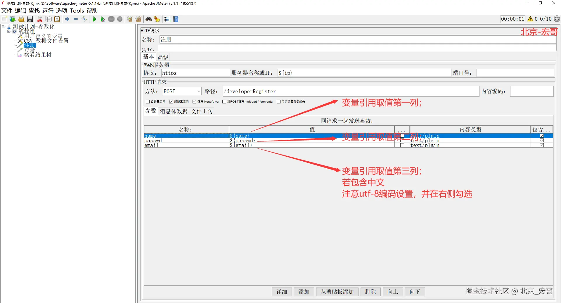 注意:引用的参数名跟用户定义变量设置的名称必须保持一致,宏哥这里例举了一个注册实例,如下图所示: