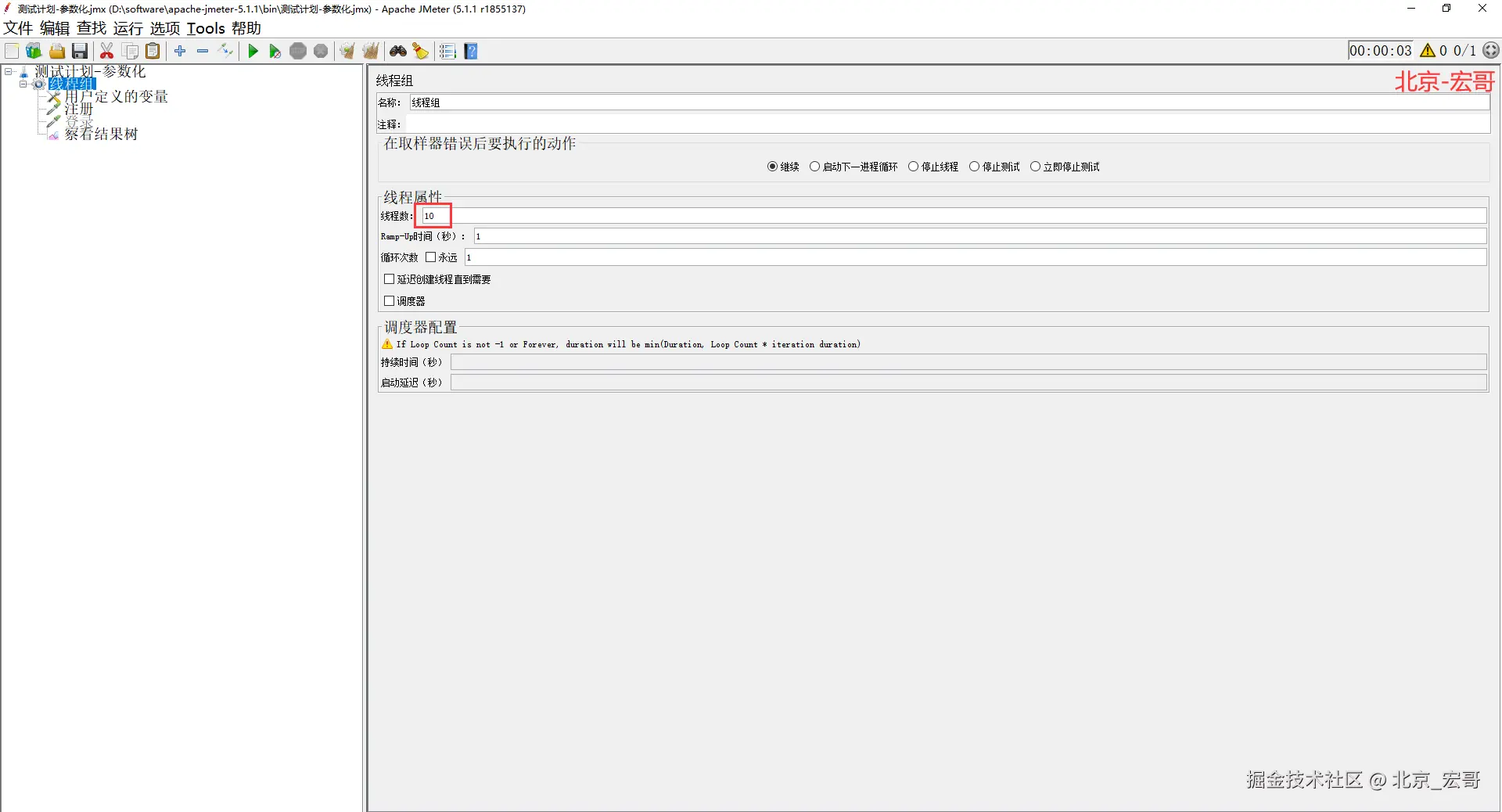 4)设置线程组线程数为10,模拟10个虚拟用户的注册,如下图所示: