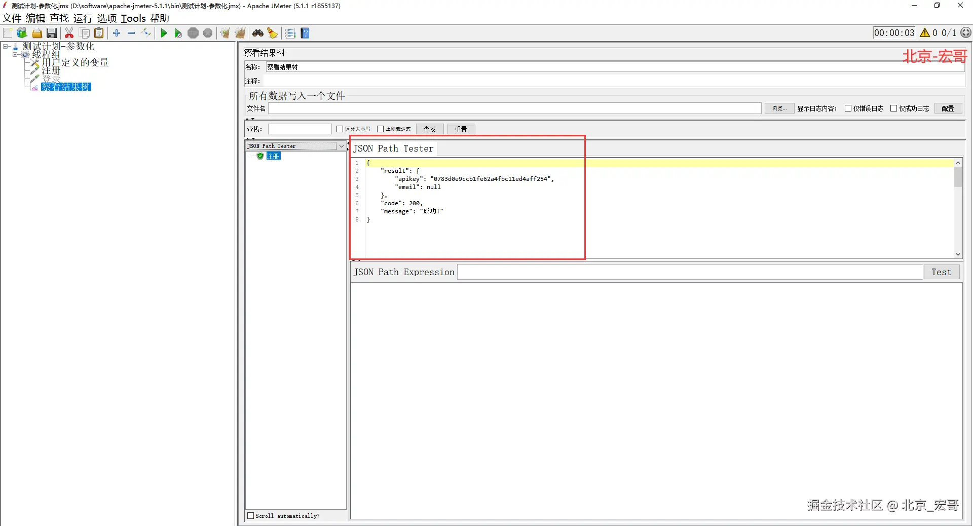 5)点击运行,查看结果树,显示成功,(宏哥这里只举例说明邮箱,用户名你可以模仿设置后《宏哥这里在“北京宏哥”后边加了一个随机函数random,这样北京宏哥后带有一个数字就不会重复了》,才能注册成功,否则会报用户名重复的错误)如下图所示: