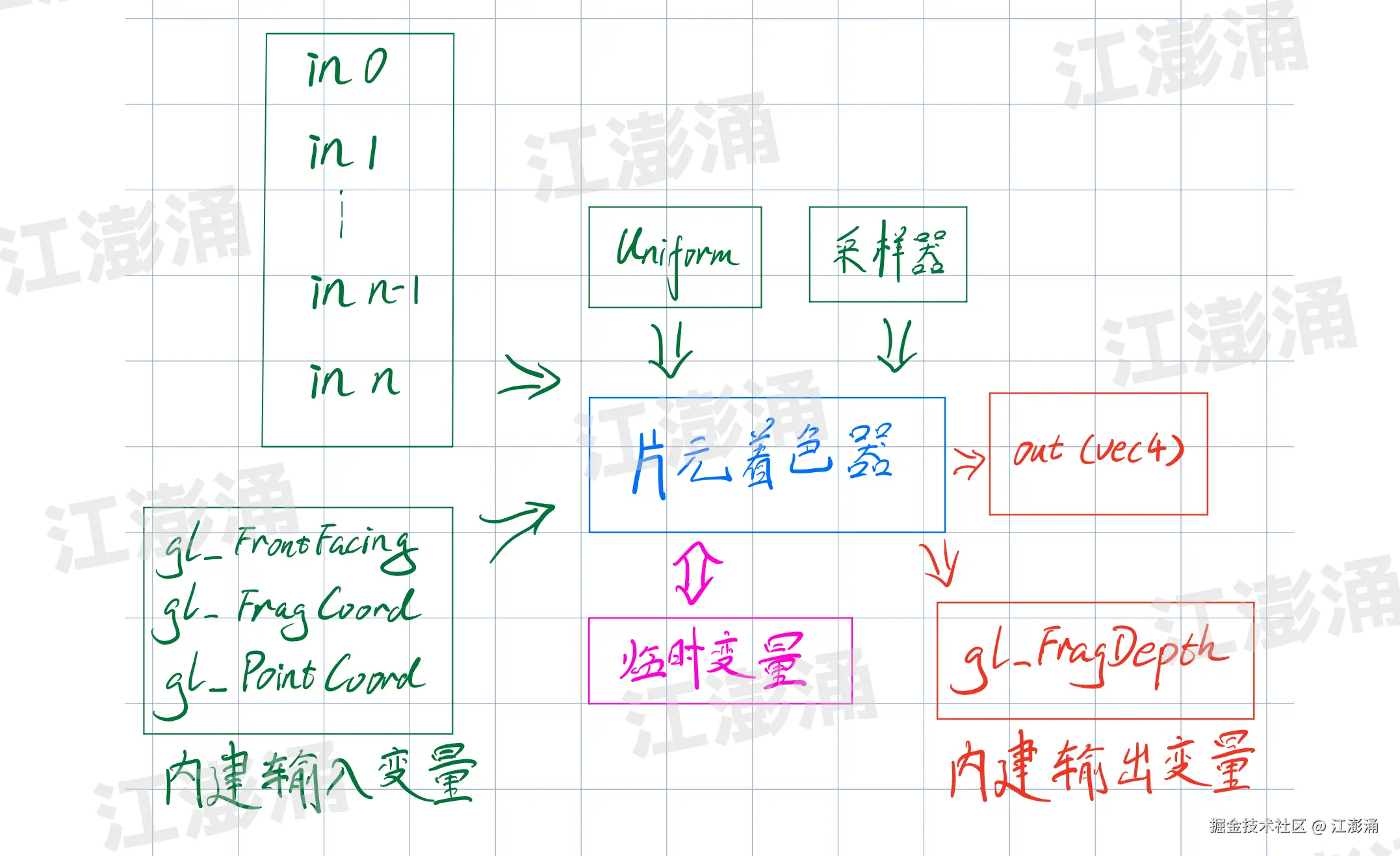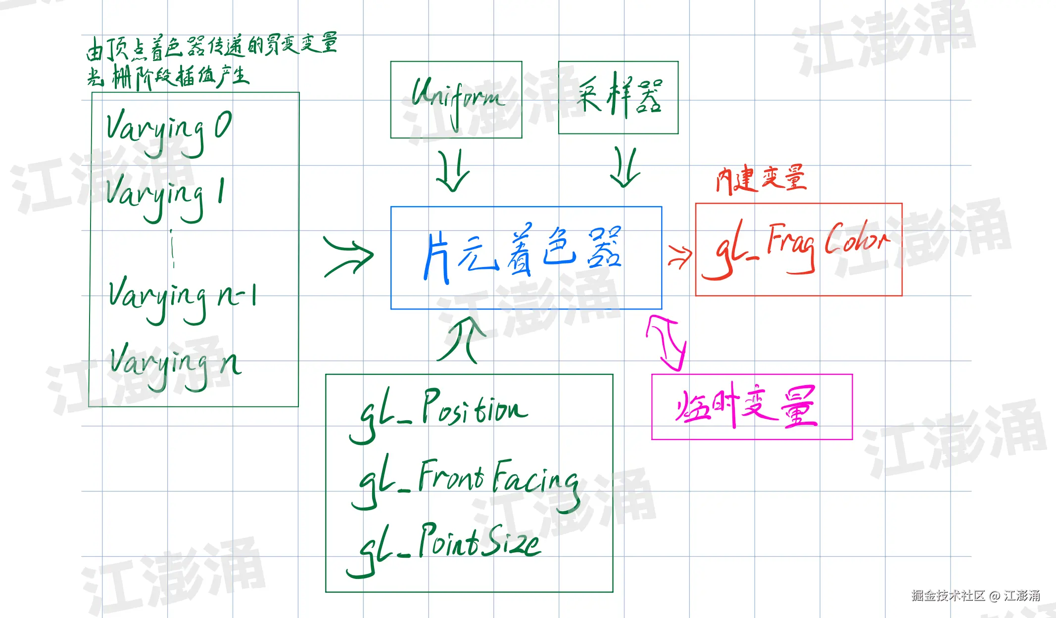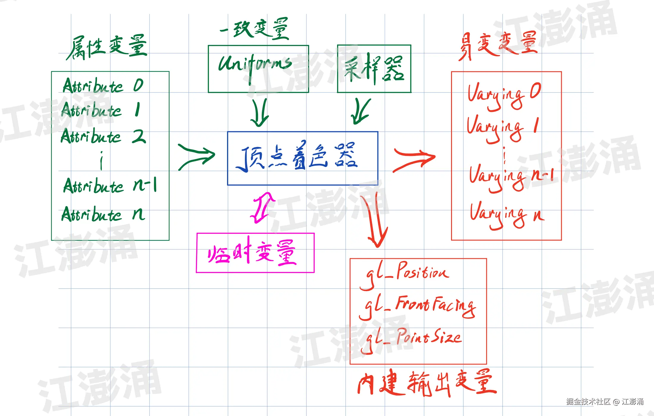 - varying 变量: 从顶点着色器传递到片元着色器的值。系统会在顶点着色器后的光栅化阶段自动插值产生,并不是顶点着色器直接产出的值。