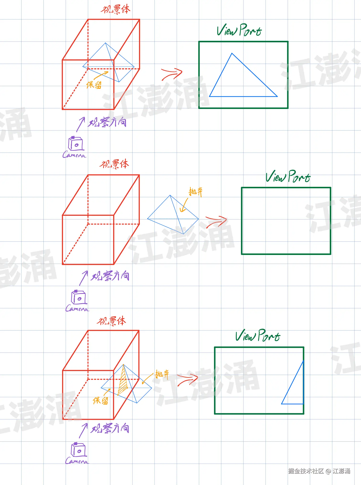- 图元部分在视景体中,则会进行增添顶点,保证视景体中的部分保留,超出的部分则抛弃;