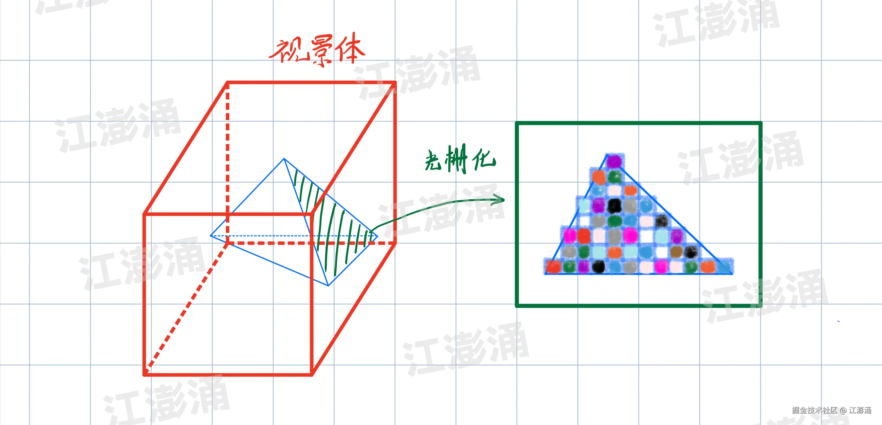 因为移动设备是通过像素来进行展示,所以需要将连续数学量表示的几何图元进行离散为一个个片元(此时不是像素)。“光栅化” 则是将连续数学量分解为离散化片元的这个动作。