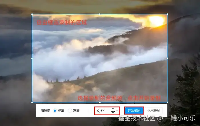 步骤2:在录制界面中,你可以通过拖动选区框的边缘,来调整录制区域的大小和位置,调整好录制区域后,你还可以设置是否录制系统声音和麦克风声音。一切都设置好后,点击屏幕上的 “开始录制” 按钮,就可以开始录制屏幕活动啦。