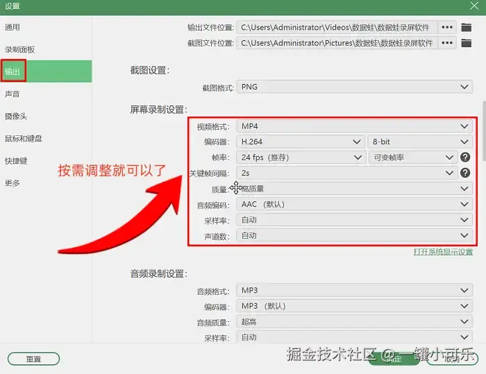 步骤2:进入屏幕录制模式后,我们就可以调整录制的视频区域和音频源了。还可以打开 “输出设置” 去调整视频的格式。全部调整好了之后,点击 “开始录制” 按钮就可以开始录制视频了。