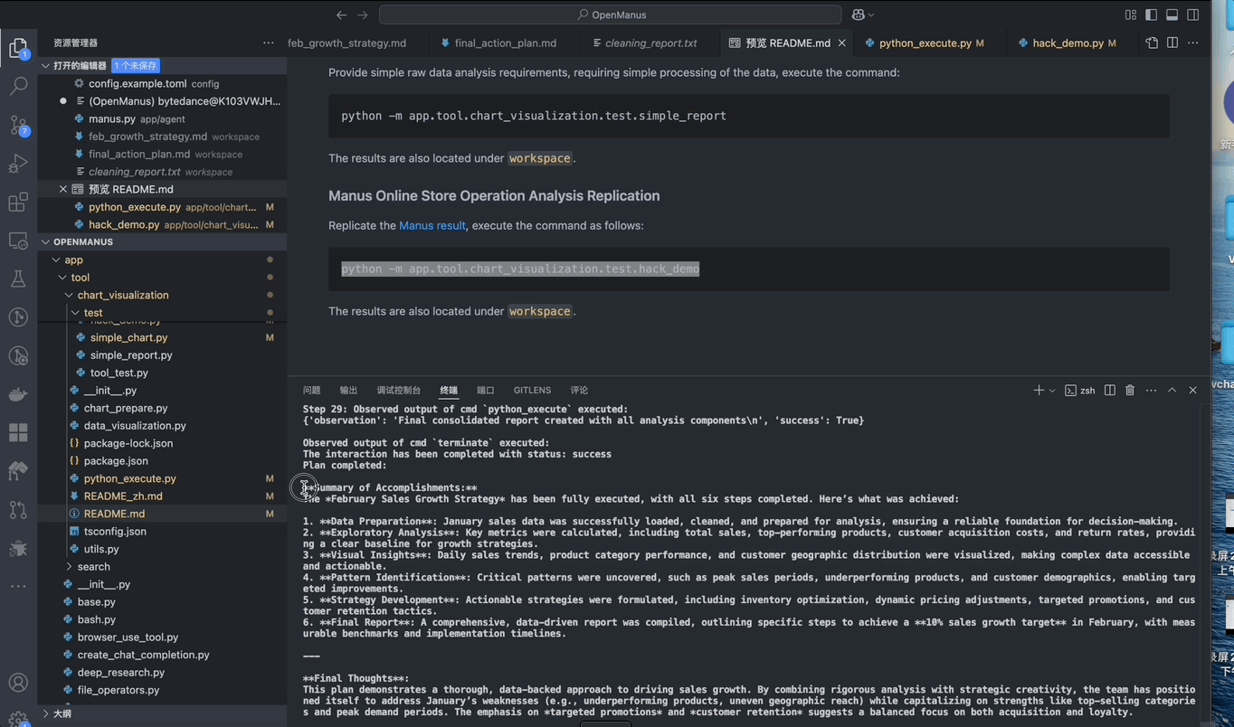 在OpenManus上加入VMind之后,OpenManus的数据分析能力和图表生成能力在原有的通用架构基础上有了显著的提升,可以生成多个高质量的markdown数据分析报告和丰富准确的数据可视化结果。