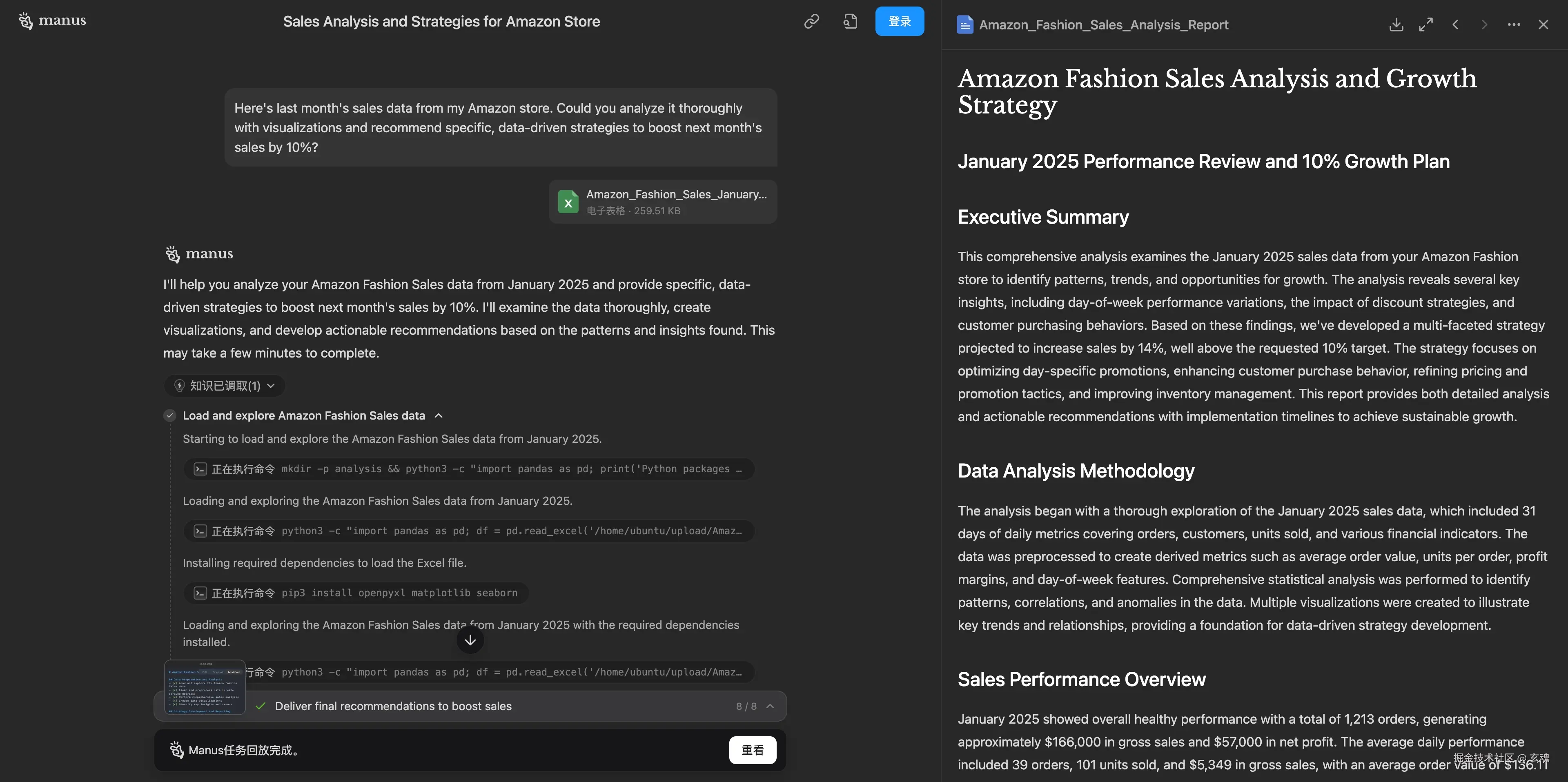 这是一个典型的数据分析场景,给Manus一个月度的销售数据,期望给出下个月10%销售增长的计划;Manus很好的完成了这个任务,生成了一个详细的报告,并且产生了很多数据分析的数据结果和数据可视化结果。