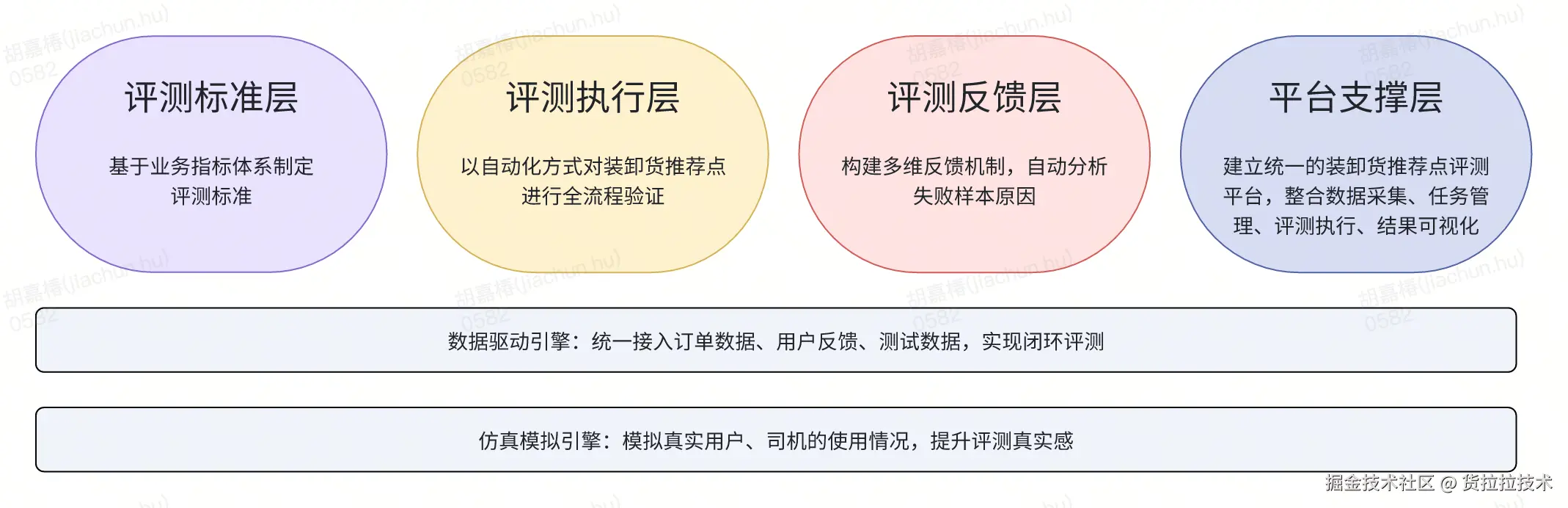 我们构建了一个“多层能力 + 双层驱动”的评测框架,皆在实现装卸货推荐点从评估到优化的全流程平台化支撑。整体框架包含四大核心层和两个支撑引擎:
