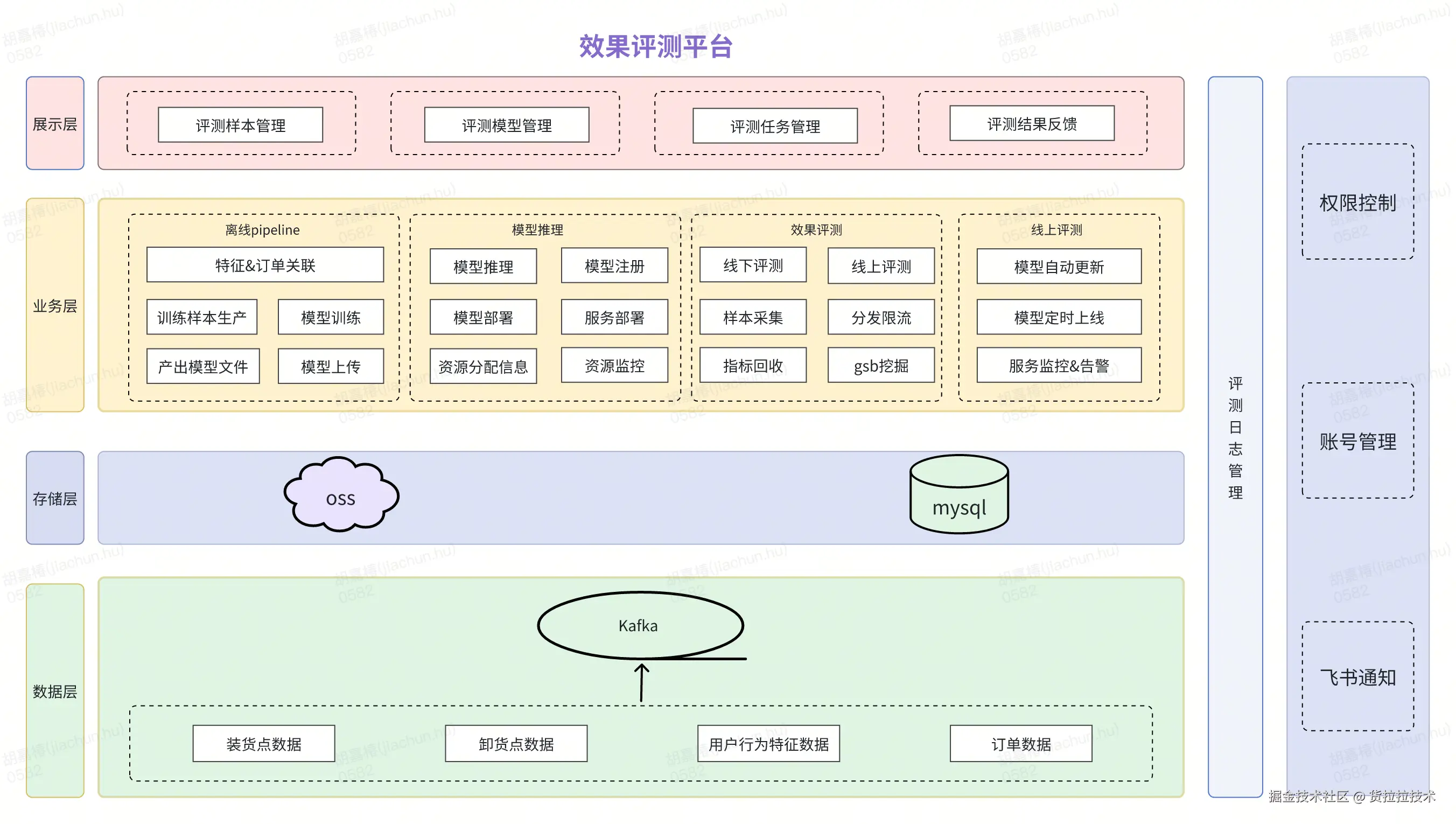 效果评测平台架构由展示层、业务层、存储层和数据层组成。这些模块协同工作,支持装卸货推荐点场景模型自动更新能力。