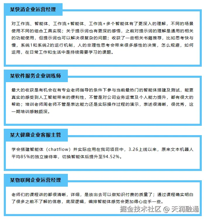 第一期智能体实战营圆满收官,参与培训的学员们对此次活动给予了极高的评价,通过四周的系统学习,大家不仅在理论层面深入理解了 AI Agent 技术,在实操方面更是受益匪浅,在培训期间,有多名学员基于所学知识,完成了所在企业智能体的搭建和测试上线。