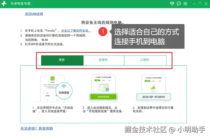 步骤1:连接设备。软件可支持的连接方式有两大类,你可以根据当下情况来抉择,看看是USB连接,还是无线连接更适合你。