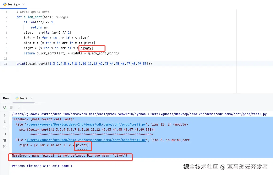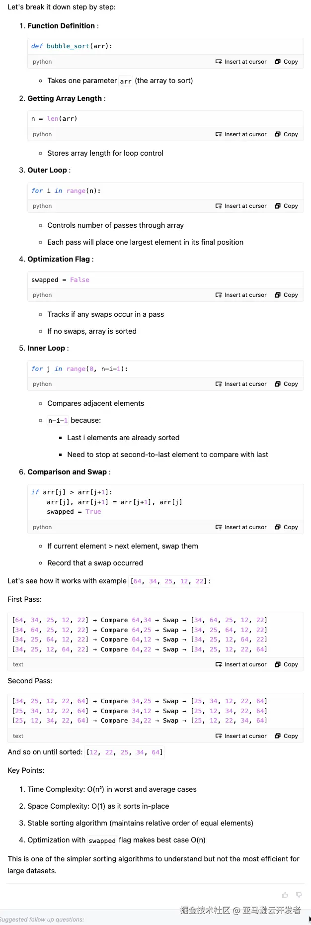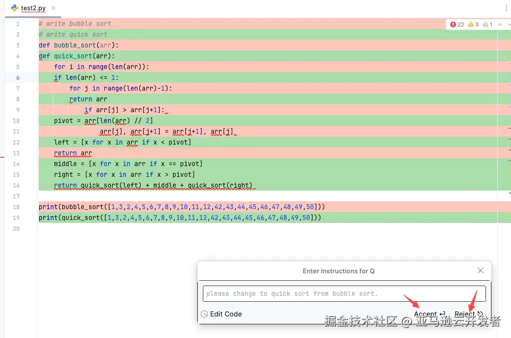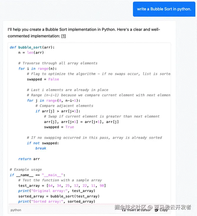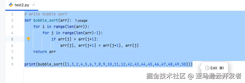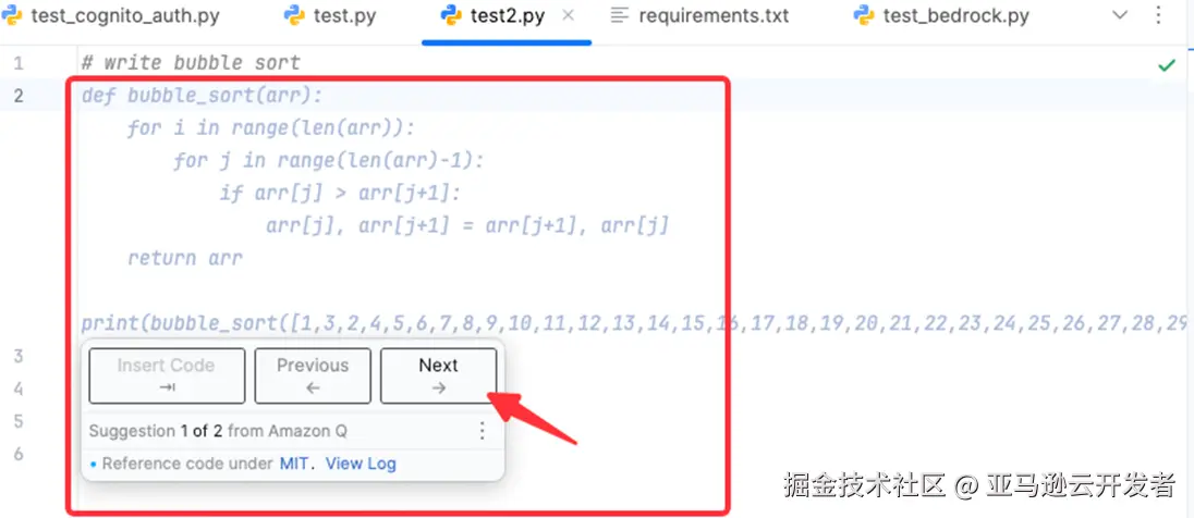 以一个 python 代码为例,如果输入 # write bubble sort,则 Amazon Q Inline Code 会弹出一个或者多个代码选择供开发者来选择。