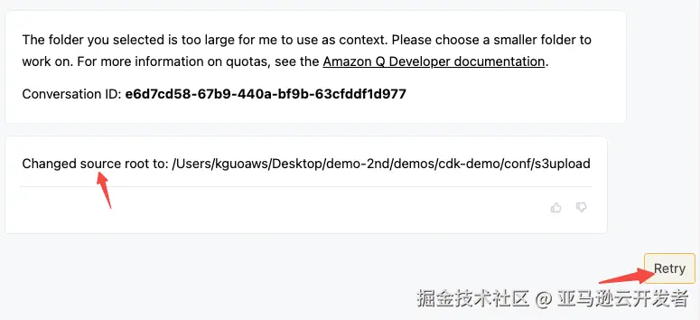 选择了正确的代码路径之后,点击 Retry,Amazon Q 会开始工作,为开发者创建创建所需要的 CDK 代码,如下图所示。
