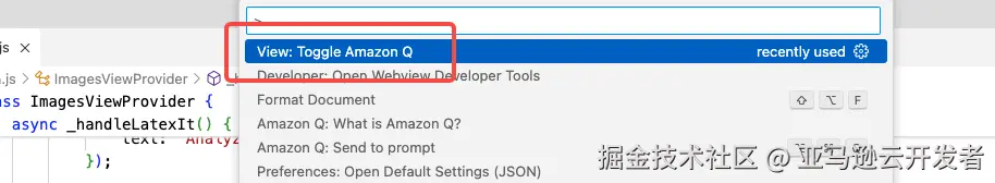 输入 Amazon Q,找到 Toggle Amazon Q,并执行,如果此时 Amazon Q 的面板并未显示,则此命令将令其显示出来,反之,将会隐藏 Amazon Q 的操作区。