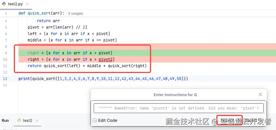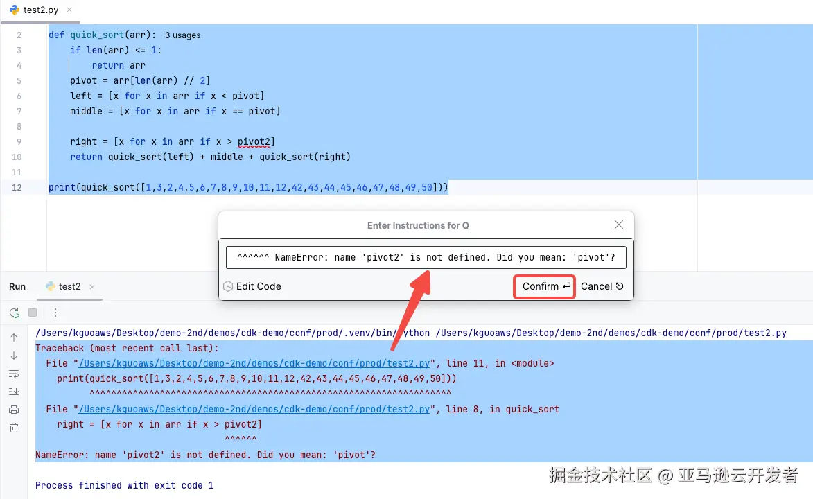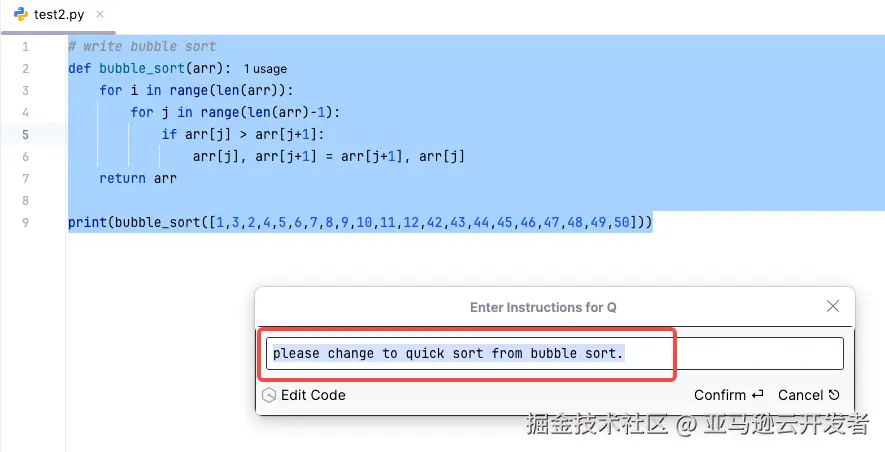 然后,按下 Command + I(windows 上为 Ctrl + I),会弹出 Amazon Q Inline Chat 的输入框,并输入一个要求,如“请改变冒泡排序为快速排序”的提示词,如下图所示。