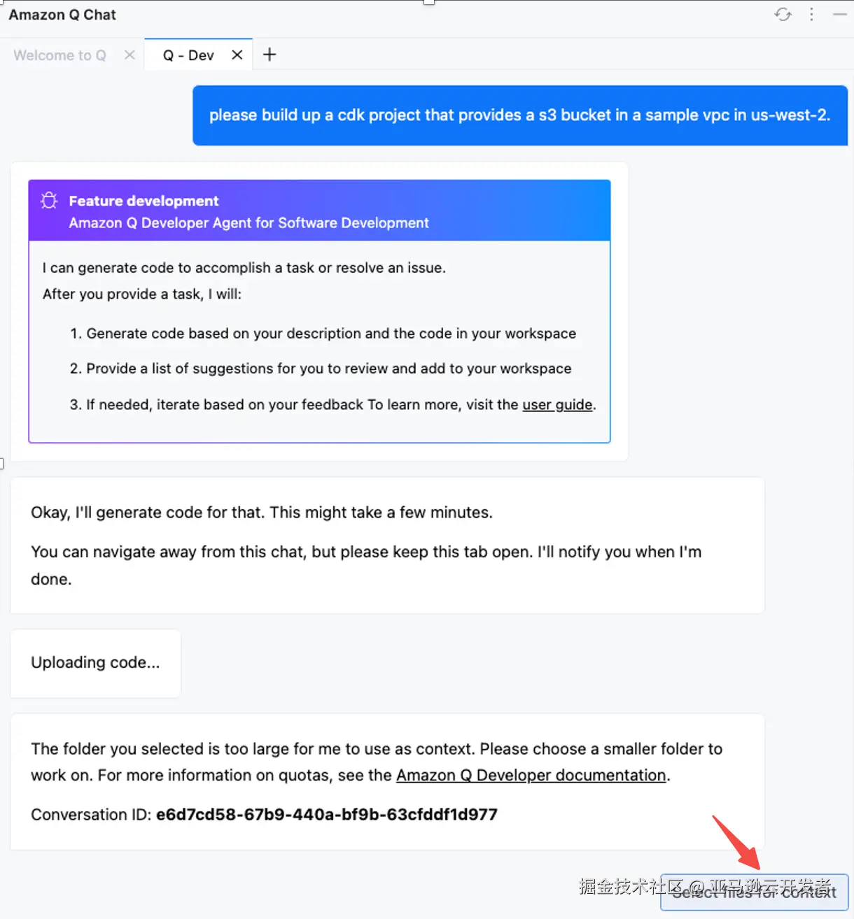 由于是第一次执行,Amazon Q 不知道在哪里创建,会要求开发者去选择代码路径。开发者通过点击 Select files for context,可以选择具体的代码路径,对本例来说,选择一个空白的本地目录即可。