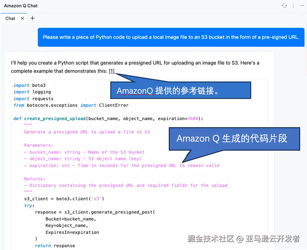 Amazon Q 会首先给出一小段描述,甚至会在可能的情况下,给出参考文档,如下图所示。