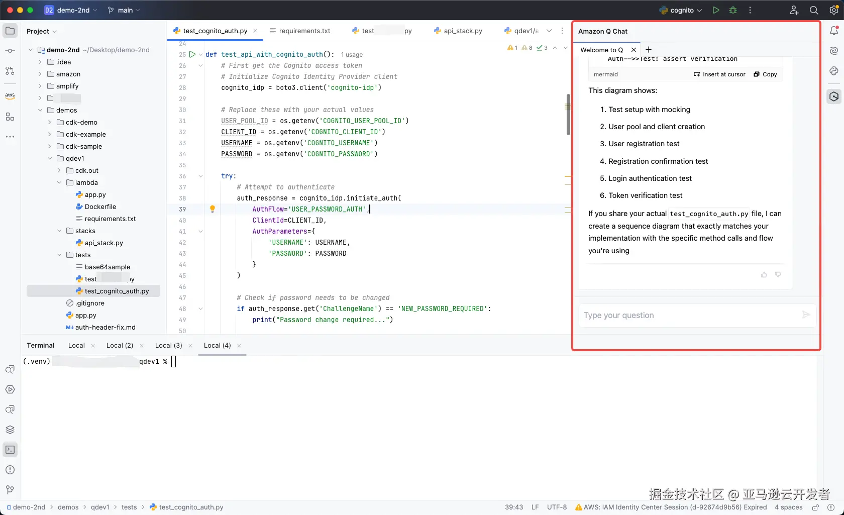 以上 Amazon Q 提供的宏观和微观的信息,既可以帮助开发者做好准备,也可以给予实际的代码样例,直接进入编程调试。