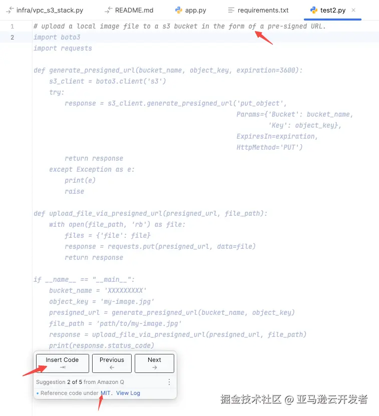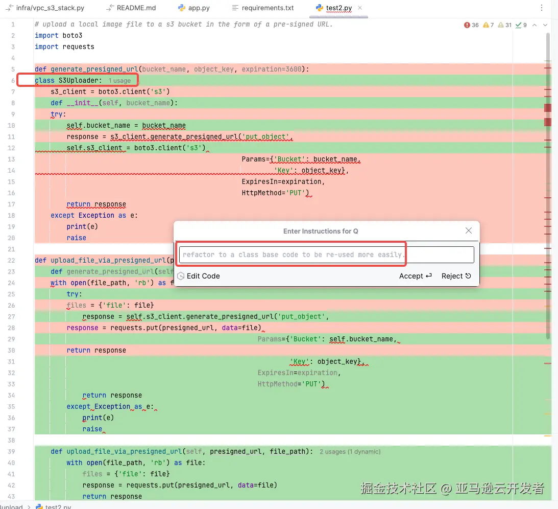 就是如此简单,Amazon Q 为开发者重构了代码,生成了一个名为 S3Uploader 的类,为开发者进一步完成实际开发人员,提供了有力的帮助。