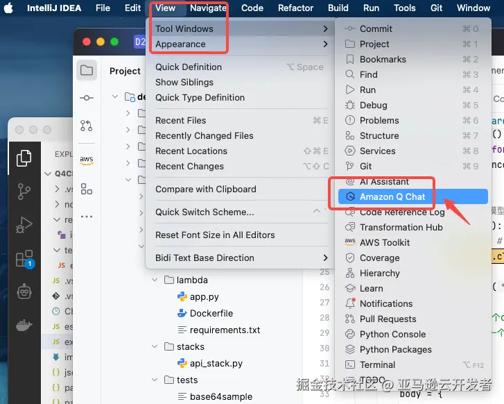 在 IDEA 的菜单里,如下图所示,选择 View -> Tool Windows -> Amazon Q Chat。
