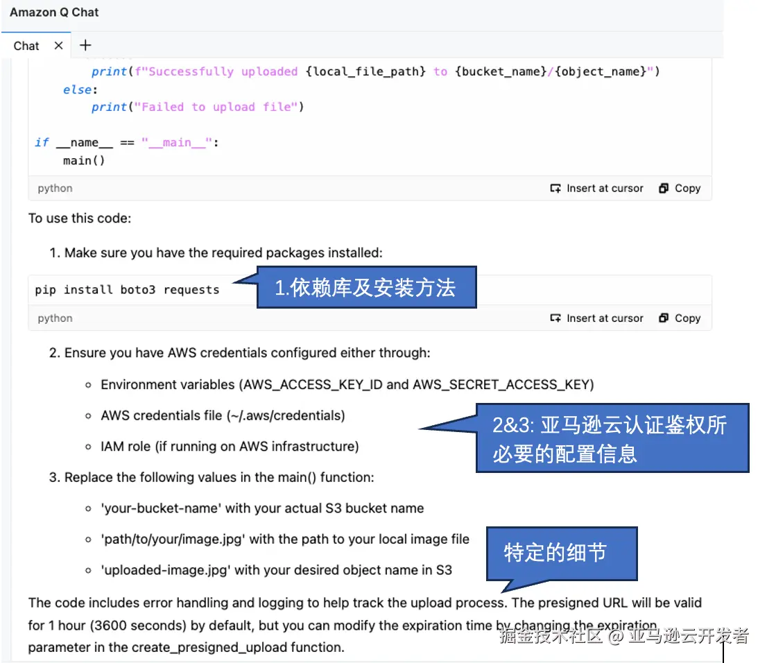 在生成代码的同时,还会给出与之相关的信息,如支撑这段代码能够顺利运行的关键依赖包,应该如何安装,应该如何配置亚马逊云密钥(多种方式),来访问亚马逊云上的 S3 桶等资源的必要信息。