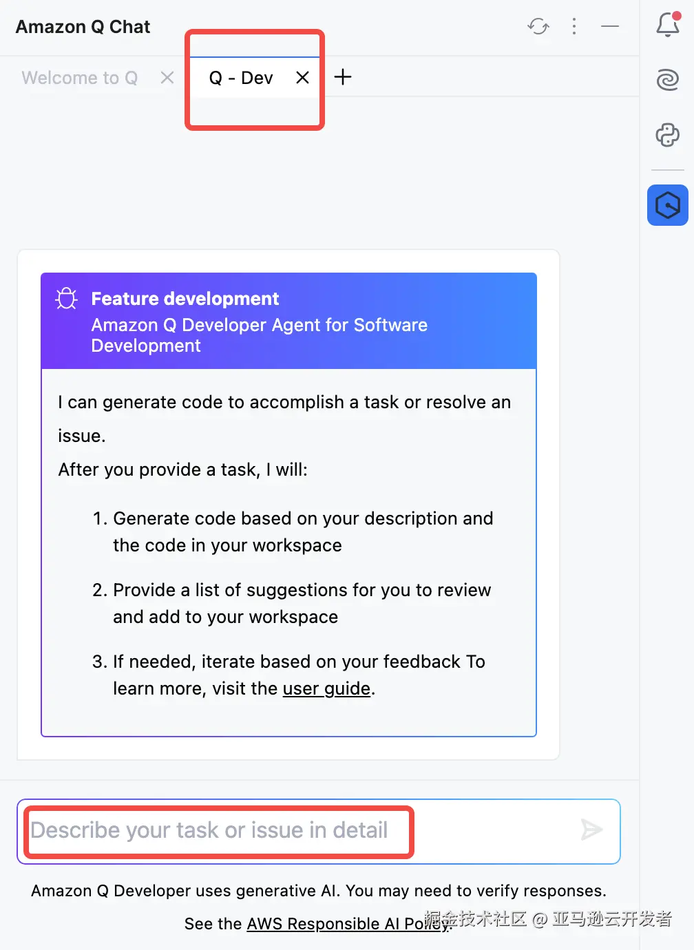 在集成开发环境中,在 Amazon Q 里输入/dev 并回车,Q 会新增一个 Tab页,“ Q – Dev”。
