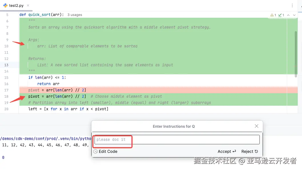 开发者可以选择一段代码并通过 Inline Chat 输入框来请求进一步地修改,Amazon Q 将生成相应的代码变更,并以差异(diff)的形式对开发者进行展示。用户可以轻松查看建议,并选择接受或拒绝这些更改。